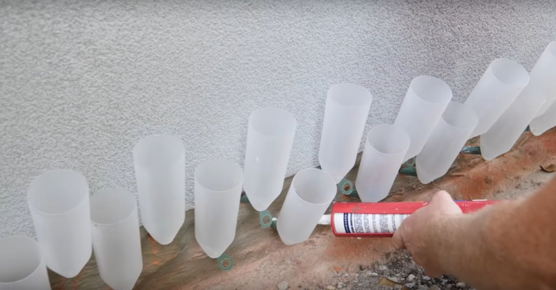 Kolejnym etapem jest aplikacja płynu iniekcyjnego, który ma usunąć wilgoć i odtworzyć izolację poziomą. Lejki wkładamy w uprzednio wywiercone i oczyszczone otwory, a następnie uszczelniamy je przy pomocy np. masy akrylowej lub kleju montażowego – ma to zapobiec wyciekom preparatu na styku lejków ze ścianą.