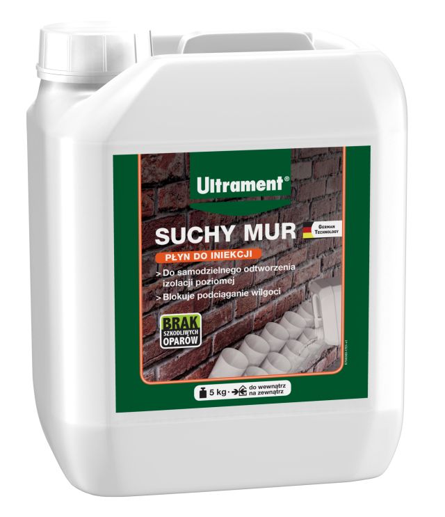 Płyn do iniekcji Suchy Mur od Ultrament to gotowy środek na bazie krzemianów, przeznaczony do osuszania murów metodą iniekcji. Dzięki nowoczesnej recepturze produkt dokładnie wypełnia kapilary w murze, gdzie pod wpływem związków alkaicznych krystalizuje się i blokuje dalsze pociąganie wilgoci oraz transport wody. Jest łatwy w użyciu i pozwala na szybkie i samodzielne wykonanie lub/i odtworzenie izolacji poziomej. Ponieważ płyn nie wydziela szkodliwych oparów i gazów oraz nie zawiera rozpuszczalników organicznych, można go zastosować tak samo na zewnątrz, jak i wewnątrz budynku.