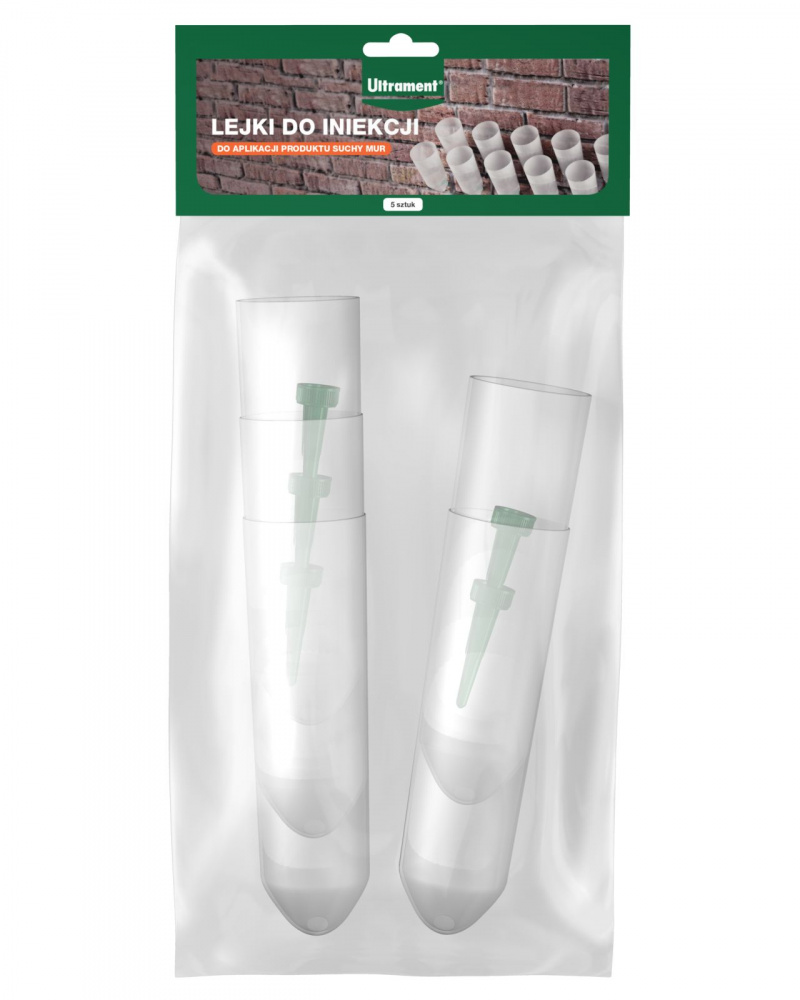 Lejki do iniekcji od Ultrament to produkt stosowany do aplikacji preparatu Suchy Mur. Odpowiednio wyprofilowane końcówki umożliwiają optymalne dotarcie i rozprowadzenie płynu iniekcyjnego wewnątrz ścian i murów.