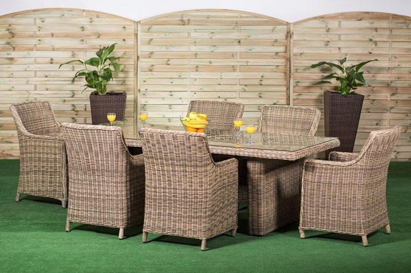 W skład zestawu wchodzą: sześć foteli oraz stół obiadowy. Dodatkiem są wygodne poduchy. Zestaw idealny do spożywania posiłków na świeżym powietrzu. Fotele posiadają podłokietniki, dzięki czemu są bardzo wygodne. Duży, prostokątny stół pokryty jest szybą z przezroczystego, hartowanego szkła o grubości 5 mm, co pomaga w utrzymaniu czystości. Zaokrąglone kanty oraz splotowe wykończenie dodają meblom charakteru. Meble wykonane z technorattanu, odpornego na promieniowanie UV. Stelaż wykonany z lekkiej, aluminiowej ramy odpornej na rdzę.