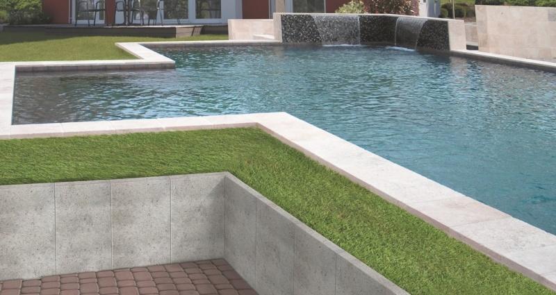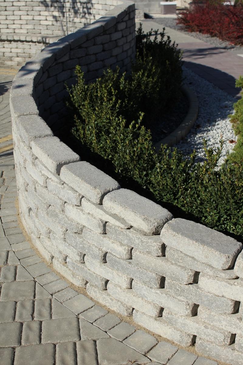 Murki mogą przyjąć też wygląd niezwykłej zielonej ściany. Wznosi się je z betonowych kształtek, które mają postać okrągłych lub prostokątnych donic bez dna. Do tego celu często wykorzystuje się specjalne donice L-ki. Ten betonowy produkt ma szerokie zastosowanie w ogrodzie. Poza podstawową funkcją niwelowania różnic wysokościowych pełni rolę elementu oddzielającego, podtrzymującego różnice poziomów oraz podparcia tarasów pod zabudowę. L-ka dzięki swojemu kształtowi utrzymuje ciężar naporu. Ustawiamy ją zawsze do środka, czyli w stronę nasypu ziemnego. Po ułożeniu L-ki możemy ją obłożyć materiałem elewacyjnym, np. bardzo modnymi płytami z betonu architektonicznego Symfonia, a donice wypełnić ziemią lub żwirem i obsadzić roślinnością.