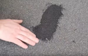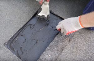 • Jeżeli uszkodzenie jest duże, należy wyciąć zniszczony płat papy. Na odkrytą część dachu szpachelką nakładamy lepik, starając się zaaplikować trochę produktu także pod starą papę. Następnie wsuwamy docięty kawałek nowej papy, i dociskamy całość (np. przy użyciu małego wałka).