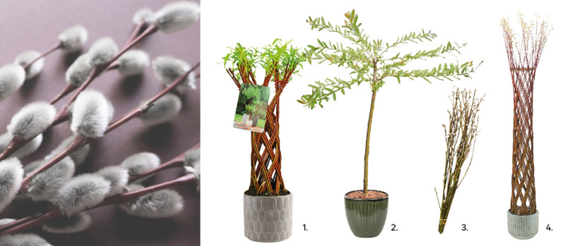 1. Wierzba pleciona warkocz 50 cm, 64,99 zł, kod 90880361, 2. Wierzba mix, 22,99 zł, kod 84895607, 3. Bazie w pęku 60-70 cm, 7,99 zł, kod 45684751. 4. Drzewko wierzba Baratta 120 cm, 119,00 zł, kod 87040962