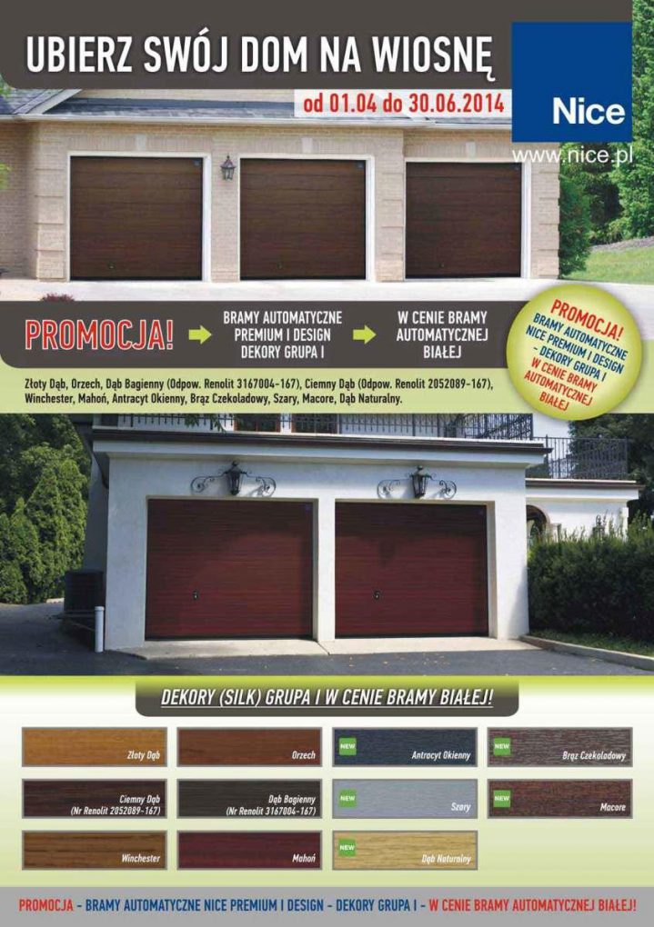 Pierwsze dni wiosny zazwyczaj oznaczają porządki oraz przydomowe prace. To również najlepszy czas na wykonanie drobnych remontów, odświeżenie domu czy ogrodu. Kiedy przyroda budzi się do życia, dom oraz ogród nabierają zupełnie innych kolorów. Nie inaczej może być z bramą garażową, która stanowi istotny element każdej posesji. Firma Nice proponuje ubranie automatycznej bramy garażowej w jeden z 11 wiosennych kolorów oklein w cenie bramy białej!