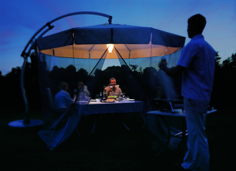 Niewiele osób wie, że alternatywnym sposobem doświetlenia stołu po zmroku jest odpowiednio dobrany model parasola ogrodowego. Wiele modeli posiada oświetlenie LED wbudowane w czaszę. Lampki są zasilane przez niewielki panel solarny umieszczony na szczycie parasola, niewidoczny z dołu. Światła solarne w zależności od modelu, mogą być formie pojedynczej lampki na srodku czaszy parasola, albo w formie listewek, które podświetlają żebra parasola od spodu. To bardzo efektowne i praktyczne rozwiązanie dla miłośników jadania kolacji na zewnątrz.