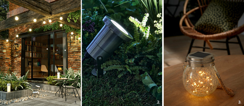 1. Kinkiet zewnętrzny Meadow 119,00 zł, 2. Reflektor ogrodowy wbijany Ada, 62,49 zł , 3. Lampka solarna Brow 69.99, zł