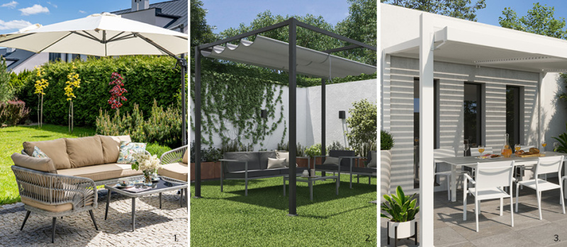 1. Parasol ogrodowy okrągły Kazuar 1299,00 zł, 2. Pawilon ogrodowy pergola Horali 297x297x223 cm szary Naterial, 1149,00 z; Dach do pawilonu Horali 187×289 cm Naterial, 119,00 zł, 3. Pawilon ogrodowy – pergola Odyssea, 7499,00 zł