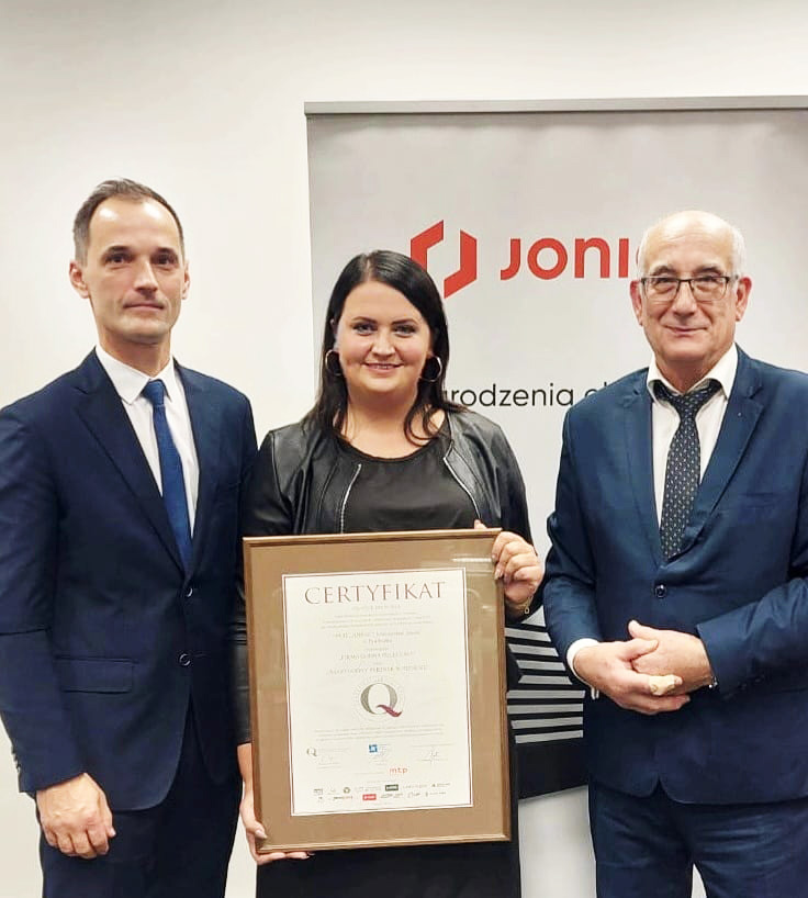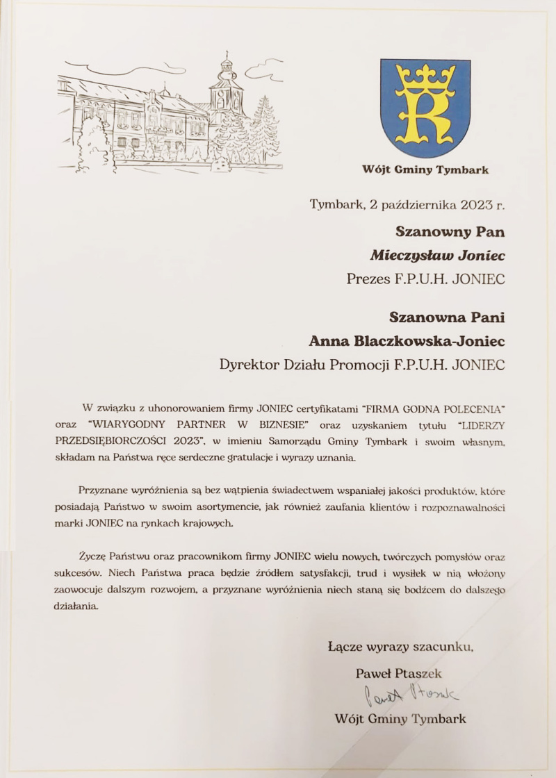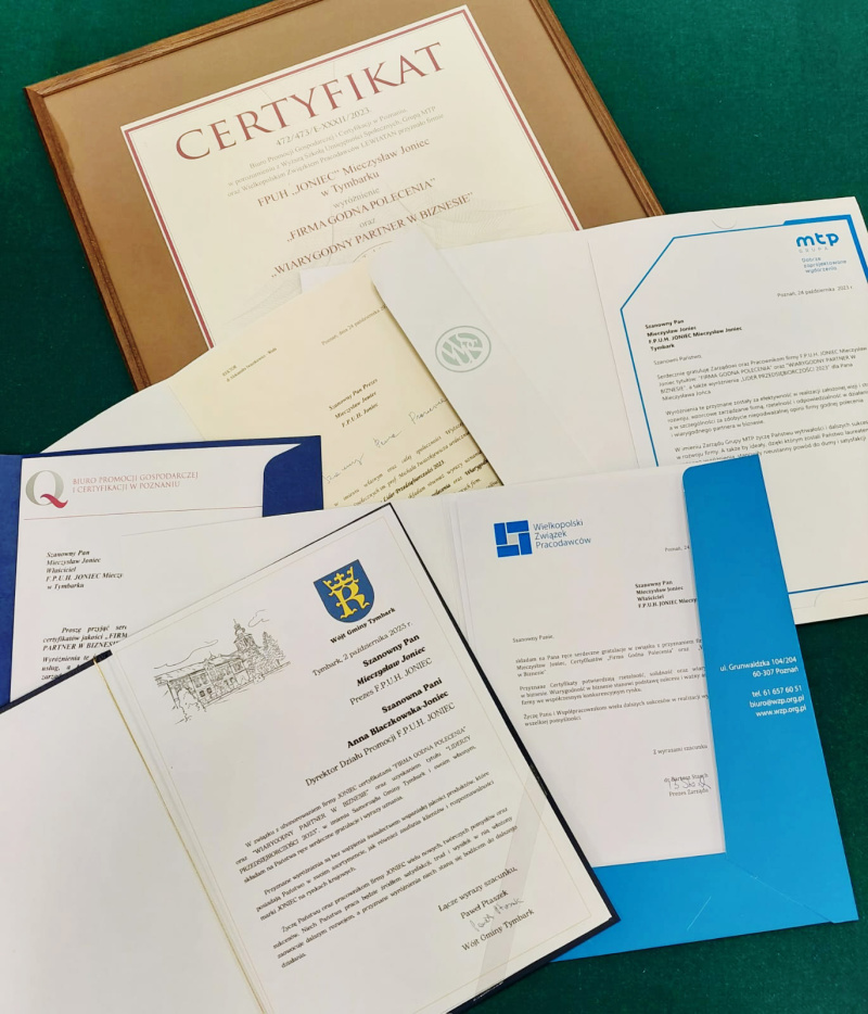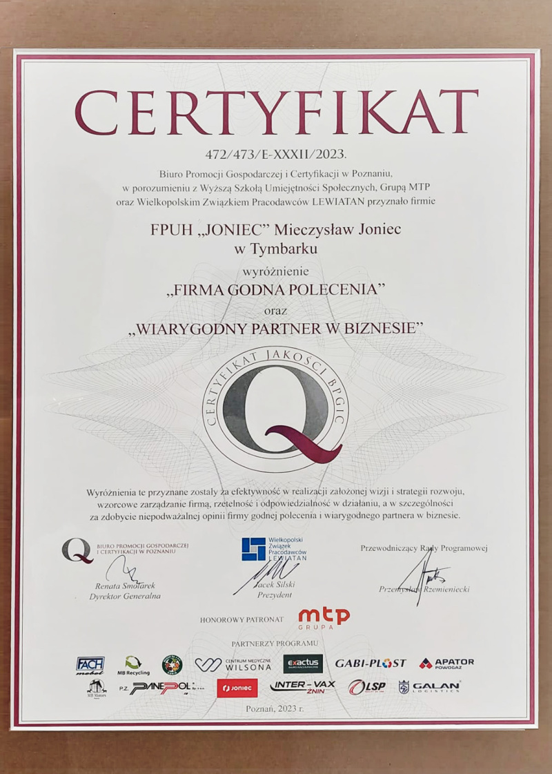 XXIII edycja Gali „Liderzy Przedsiębiorczości” odbyła się 24.10.2023 r. w Wyższej Szkole Umiejętności Społecznych w Poznaniu. Firma JONIEC® uhonorowana została tytułami „FIRMA GODNA POLECENIA” oraz „WIARYGODNY PARTNER W BIZNESIE”. Mieczysław Joniec – właściciel firmy JONIEC® – otrzymał tytuł „LIDER PRZEDSIĘBIORCZOŚCI 2023”. Certyfikaty odebrali przedstawiciele firmy: Monika Wieczorek – Dyrektor Handlowy oraz Ryszard Florek – Kierownik Handlowy.