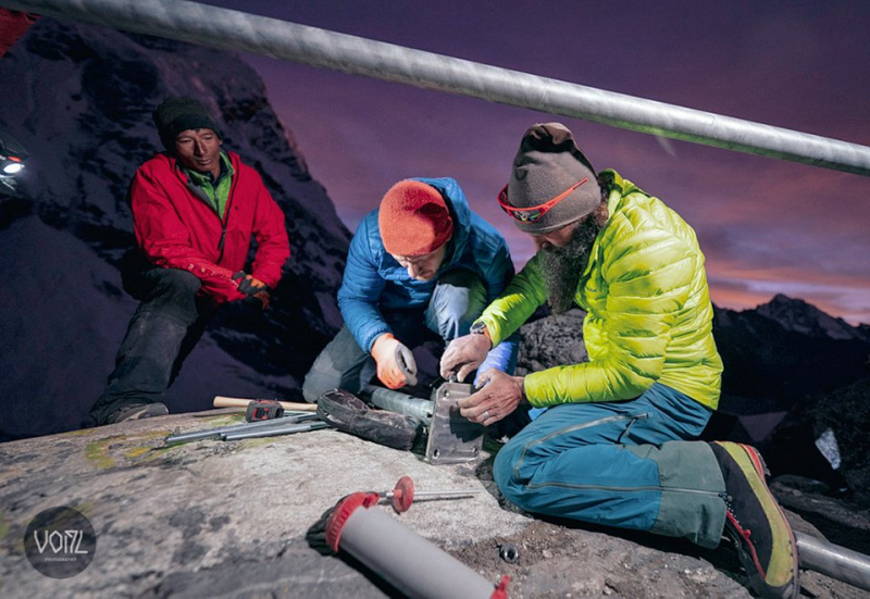 „Nogi” biwaku zakotwiczono w skale za pomocą prętów gwintowanych na głębokości około 30 cm. Szybkoutwardzalna zaprawa fischer zapewnia dodatkowe bezpieczeństwo.Prawa autorskie: Fabio Keck / Bergkult Productions