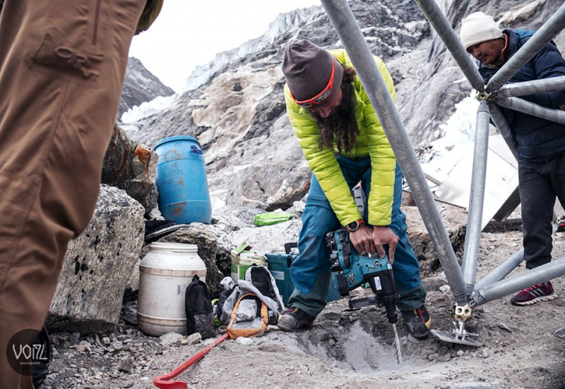„Pierwsze trzy dni poprowadziły nas przez moreny lodowcowe, lód i kamienie.- wspomina Ralf Ohnmacht – Potem krajobraz zmienił się w naprzemienne koleiny lodowe i via ferraty. Sprawę dodatkowo komplikował fakt, że helikopter nie był w stanie po prostu przetransportować elementów konstrukcji na przełęcz z Katmandu ”. Powodem tego jest fakt, że helikopter, który może transportować części ważące około 800 kilogramów w nizinach Alp, może transportować maksymalnie 150 kilogramów za pomocą takli na wysokości ponad 5000 metrów ze względów bezpieczeństwa. Jeden duży zestaw narzędzi i trochę materiału zajmuje już dopuszczalny załadunek. Nepalscy tragarze nosili trzy – metrowe, aluminiowe części biwaku przez większą cześć trasy, a helikopter był używany tylko do ostatnich metrów wysokości.