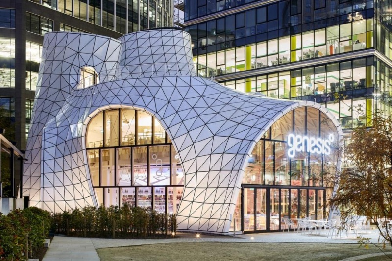 Budynek Genesis stanął na Placu Europejskim, dość nowej przestrzeni publicznej w Warszawie, zlokalizowanej u stóp biurowca Warsaw Spire. Jest jednym z pierwszych projektów w Warszawie, przy którym w tak dużym stopniu korzystano z modelowania i wydruków 3D. Dzięki pomocy komputerów można było opracować formę futurystycznego i organicznego pawilonu restauracyjnego.