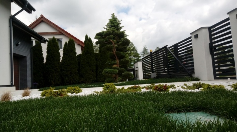Ogród ten to połączenie miłości do minimalizmu, traw ozdobnych oraz bieli. Wyróżniającym się dodatkiem w części frontowej jest Juniperus horizontalis w formie Bonsai.