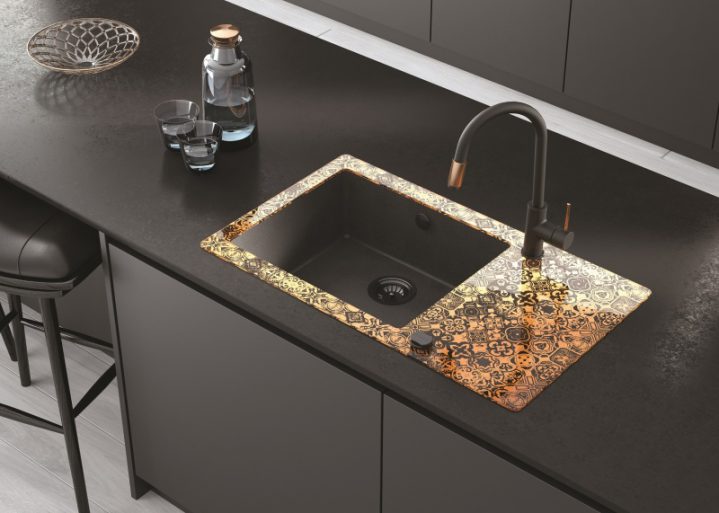 Mozaikowy wzór ma metaliczny kolor dzięki paście z dodatkiem metali szlachetnych, naniesionej ręcznie na spodnią powierzchnię szkła. Zlewozmywak dostępny jest w trzech wersjach: platynowej z efektem lustrzanym, złotej oraz miedzianej z mieniącymi się drobinkami. Delikatny połysk ma także czarna komora, wykonana z granitu z dodatkiem srebra. Całości dopełniają eleganckie czarne detale: sito odpływu, korek automatyczny oraz przelew.